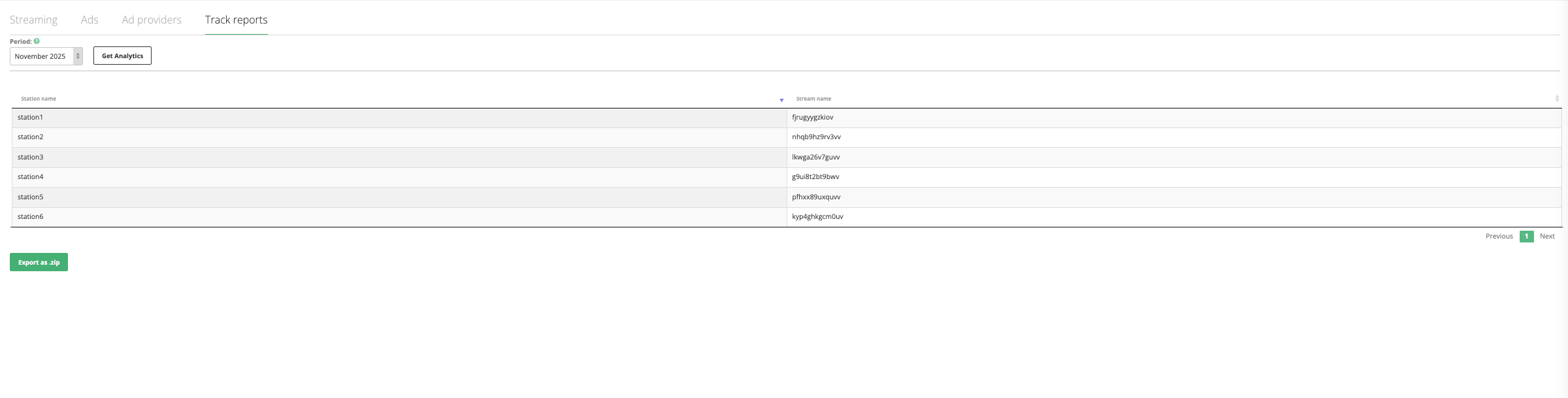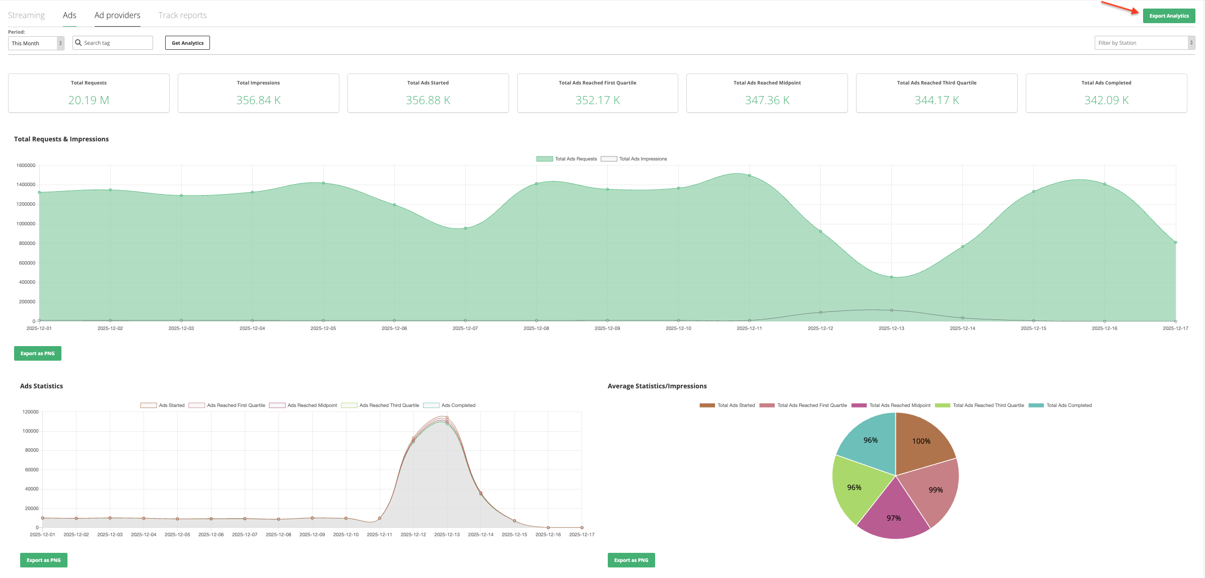 As in the other Analytics tabs, "Ad providers" will also contain the option to filter the data per station as well as to export the whole report as a pdf file.